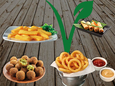 Potato Pops / Onionrings (6 Stk.) / Falafel (8 Stk.) / Frühlingsrolle (10 Stk.). Dazu 2 Dips gratis.